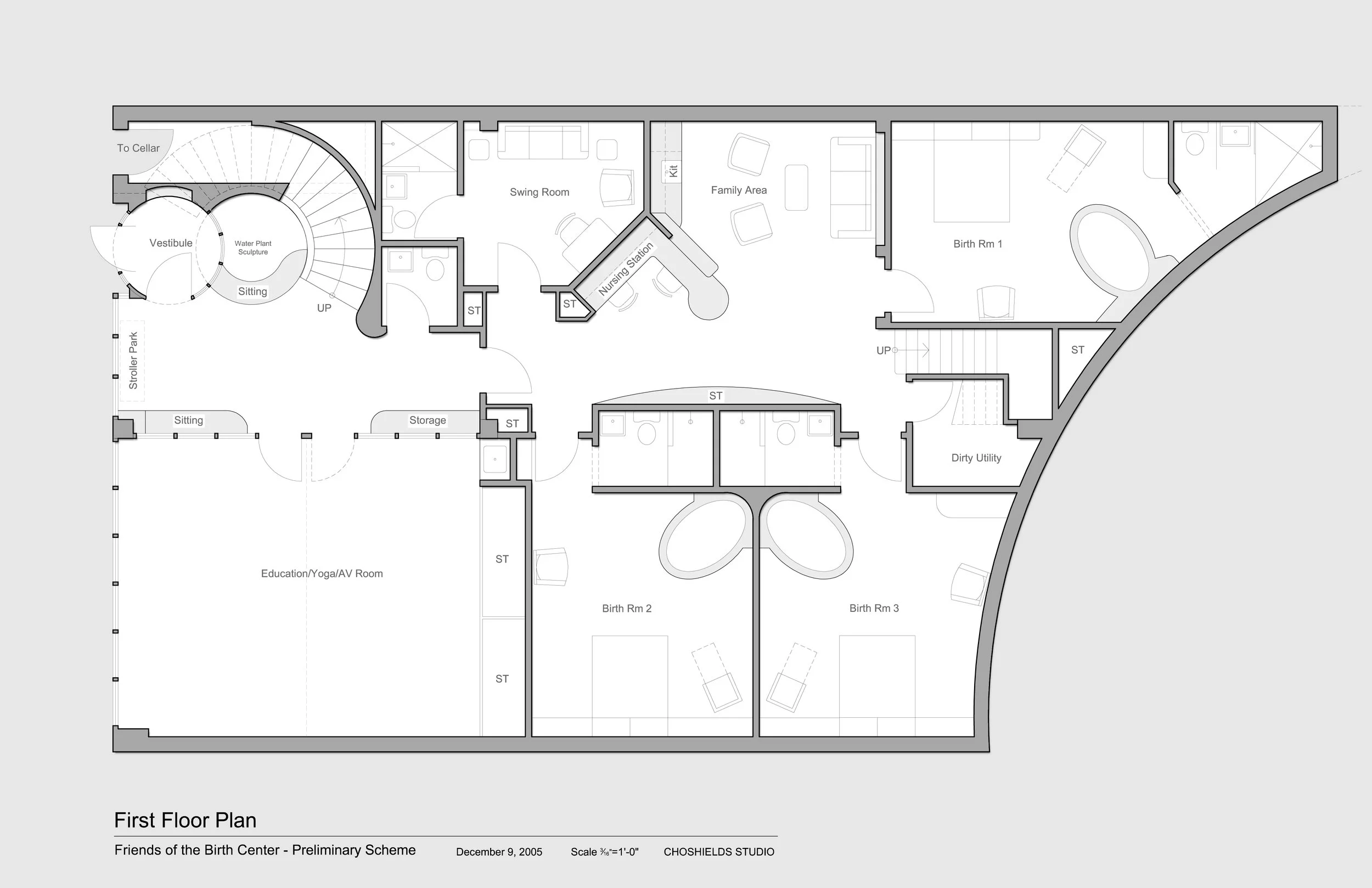 Feasibility study for planned free-standing birth center. Complex programming of public uses adjacent to private ones in an existing building shell. Yoga center, birthing rooms, nurse station, utility rooms and all support programs on ground floor; reception, administrative offices, exam rooms, labs, and support programs, and education and media room on the second floor. Layout integrates all necessary programming and functions into the very constrained available square footage.